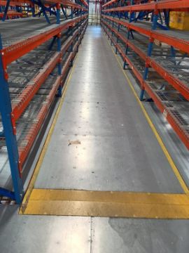 Mezzanine structure, 4 levels, metal structure with chipboard and steel sheet mezzanines, 14-step metal stairs, (1) gravity slide for order unloading, consisting of (4) 42"x395" frames, (24) 2-1/2"x96" beams, (1) gravity slide for order unloading, consisting of (2) 42"x235 frames, (8) 2-1/2"x96" beams.. Location: Tijuana, B.C.