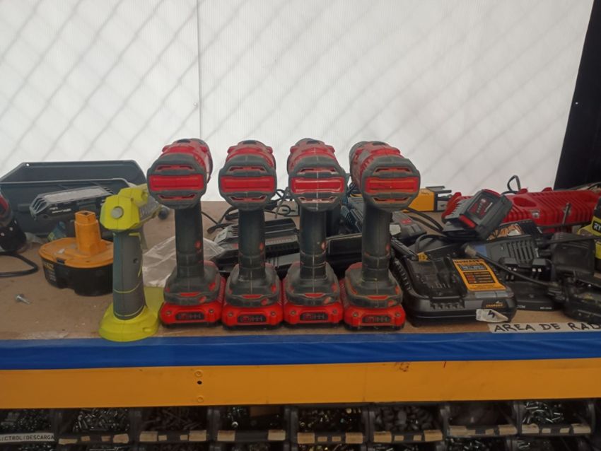 Tool Lot, Consisting of approximately (60) pcs of power tool and material, cordless impact wrenches, cordless rotary hammers, battery chargers, bench grinder, circular lock, electric plunger, linear lock, chemical canisters, refrigerant gas tanks, includes rack. Location: Tijuana, B.C.