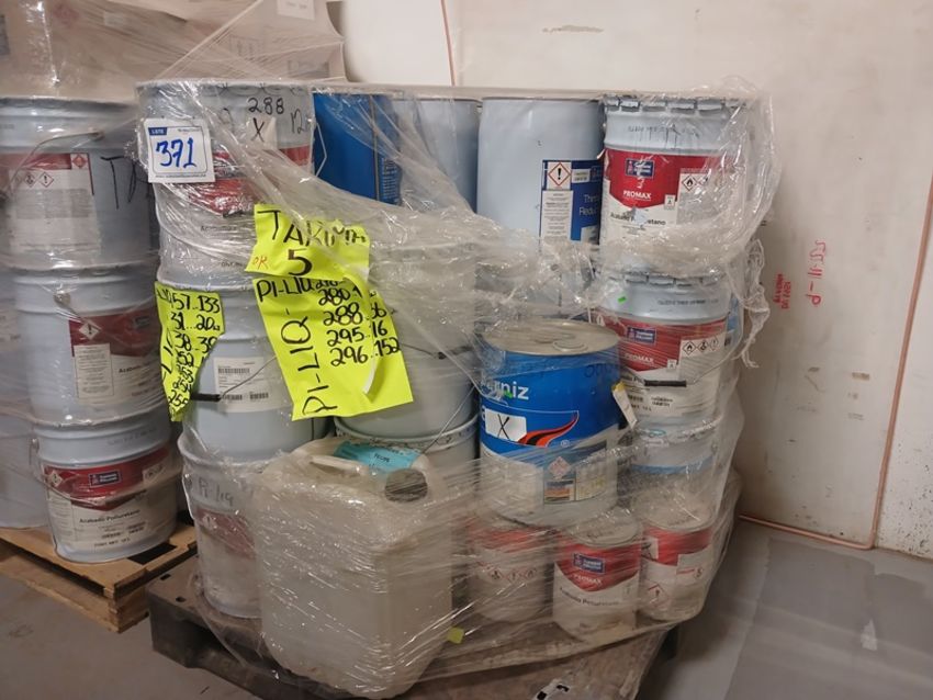 { Group of lots: 370, 371, 371A, 372, 372A } LOT OF APPROXIMATELY (4,265) LITERS OF PAINTS, ENAMELS, ADDITIVES AND BASES, COMPOSED BY: (258) LITERS OF POLYURETHANE VARNISH, SEVERAL COLORS, (552) LITERS OF CATALYST, SEVERAL TYPES, (5) ENAMEL PAINT PAINTS, SEVERAL COLORS, (573) LITERS OF POLYURETHANE, SEVERAL PRESENTATIONS, ALSO INCLUDES: RETARDER, DIRECT SHINE, REDUCERS, METALITE, PROTECTORS, DRYERS, MATIZERS, ETC. (REQUEST FOR DETAILS).. LOCATION: TEXCOCO, ESTADO DE MEXICO