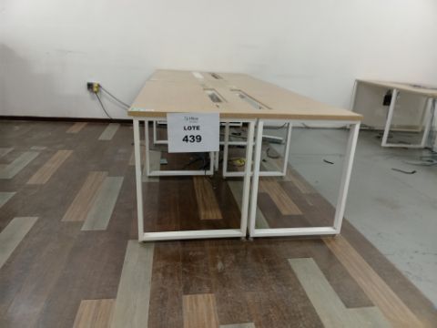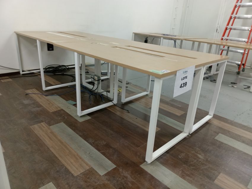 LOT OF (14) PIECES OF OFFICEFURNITURE, COMPOSED BY: (12) OFFICE TABLE WITH CABLE ENTRIES, METAL BASE AND LAMINATED WOOD TABLE, (1) HORIZONTAL DESK TABLE WITH METAL BASE AND LAMINATED WOOD TABLE, (1) LAMINATED WOOD RECEPTION DESK.. LOCATION: TEXCOCO, ESTADO DE MEXICO