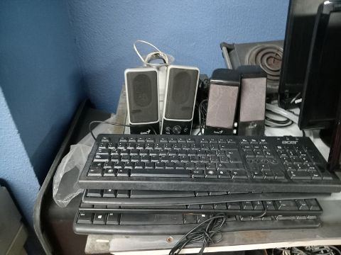 Lot of computer equipment and spare parts, Consisting of (3) monitors, (2) CPUs, (5) mice, (4) keyboards, (3) speaker sets, (2) switches, a metal cabinet, and (2) work tables.. Location: Tlalnepantla, Estado de Mexico