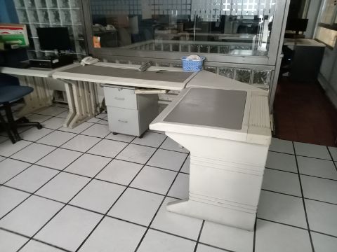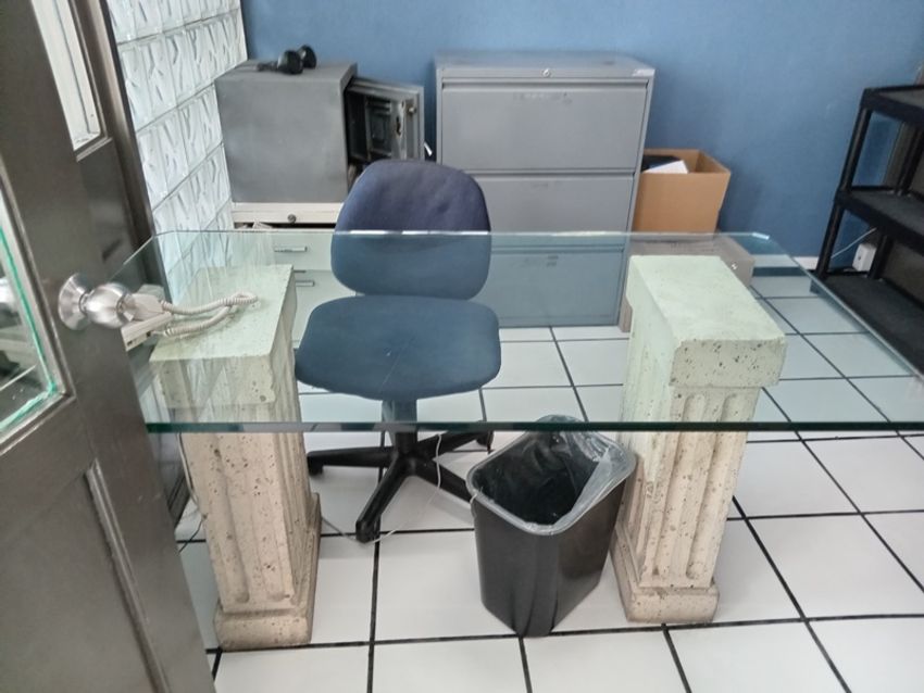 Lot of office furniture, Consisting of (3) plastic desks, a glass desk, (5) office chairs, a padded chair, (4) metal cabinets, plastic drawers, a glass shelf, (2) filing cabinets, a water dispenser, and a safe.. Location: Tlalnepantla, Estado de Mexico