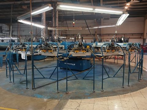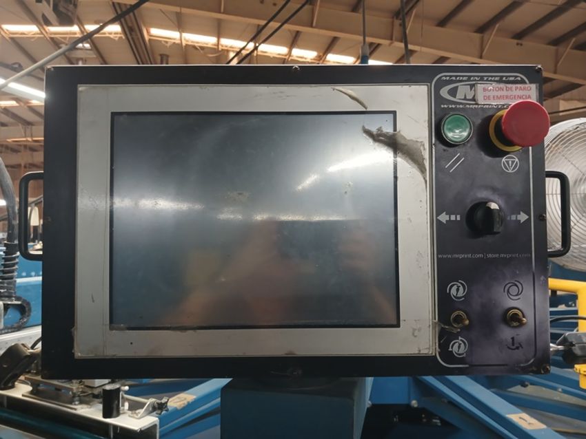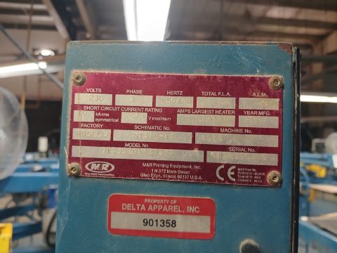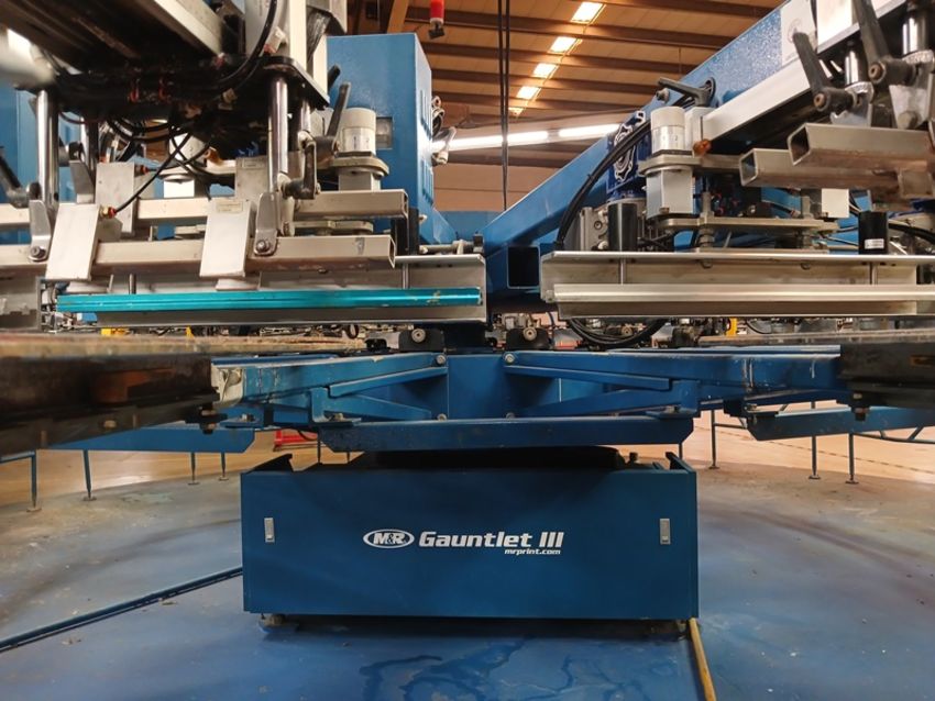 Automatic screen printing machine, YEAR: 2017, SERIAL: 412290531G, 18 heads, maximum printed image size: 19"w x 28", power: 2300v, 3phase, 50/60hz.M&R Gaunlet III . LOCATION: Campeche, Campeche