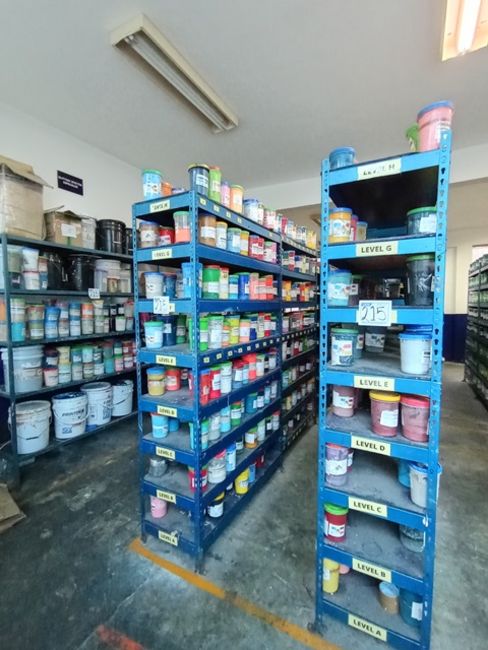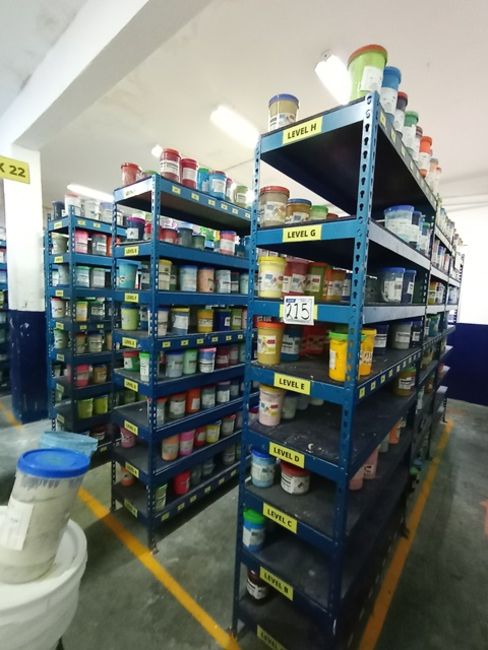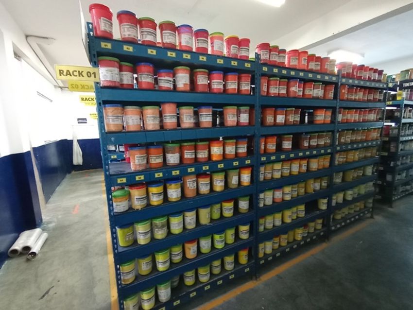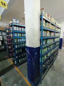 Plastisol textile ink lot, Consisting of: (25) 8-level metal shelves, made up of approximately (2500) pcs. of plastisol paint cans for use in textile screen printing. (multiple colors).. LOCATION: Campeche, Campeche