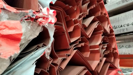 Lot of approximately (1,000) pieces of roofing trim and trim, Formed by: 3.05m rainwater downspouts, 3.05m lat intertile lower channels, 3.05m side channel skirt lower moldings, metal starting gutters, 3.05m side profiles, classic ventilated canopy leaks, 3.05m lat canopy moldings 3.05m insulated panel profile, etc., Contained in 16 sections of metal rack, (Rack not included), Label No. 50. Location: El Marqués, Querétaro