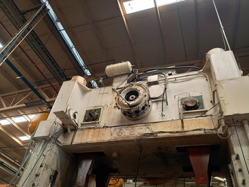 800 Ton Verson S4-800-120-72-T Straight Side Mechanical Stamping Press, Year: 1984, Serial: 28126, Bed Area: 120" LR x 72" LB, Shut Height: 79", Speed: 18 spm, Stroke: 30", Slide Adjustment: 2", Air Clutch and Break Assembly, Delta Terminal, PLC Control Panel. Needs reapair, $20,000 USD to repair – 1 weeks duration; (TAG: A3). Location: Arteaga, Coahuila